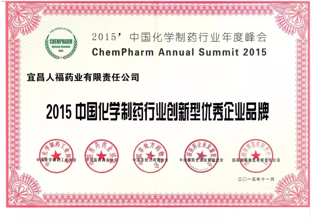 ?????? 宜昌人福藥業榮獲企業綜合實力百強(第35位,2014年為第38位)和創新型企業優秀品牌,注射用鹽酸瑞芬太尼和枸櫞酸舒芬太尼注射液獲得神經、精神系統類優秀品牌,鹽酸氫嗎啡酮及注射液和鹽酸納布啡及注射液獲得仿制藥特設獎等榮譽稱號;武漢人福藥業榮獲2015中國化學制藥行業成長型優秀企業品牌;人福普克藥業榮獲2015中國化學制藥行業制劑出口型優秀企業品牌;湖北人福藥用輔料榮獲2015中國化學制藥行業藥用輔料優秀企業品牌。