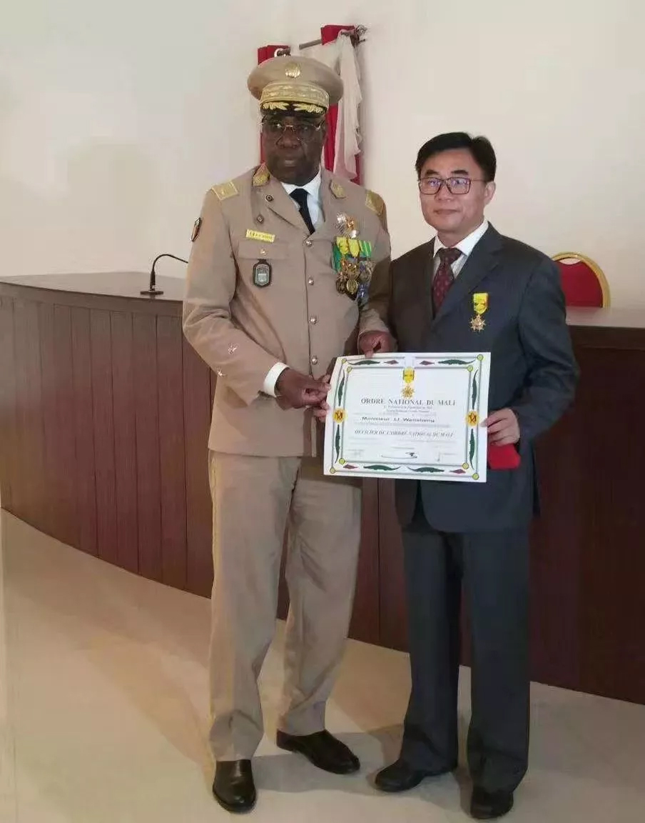 ?? ? ? 馬里當地時間7月18日,鑒于為馬中友誼以及為馬里人民健康所做出的杰出貢獻,受馬里總統易卜拉欣·凱塔閣下的委托,由馬里授勛委員會向人福非洲藥業總經理李文勝先生頒發了馬里國家級軍官勛章。這枚勛章是馬里除向別國元首外,向外國人士授予的最高級別勛章,在馬里華人企業家中也尚屬首次。