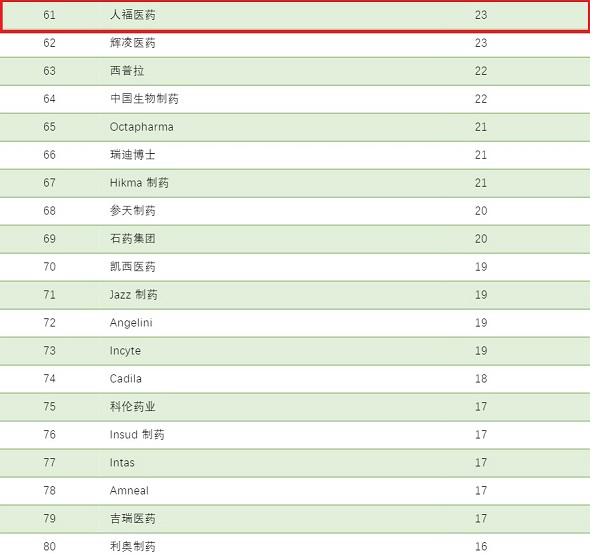 ? ? ? 根據醫藥咨詢公司 Novasecta 的一份全球制藥公司 100 強榜單,人福醫藥集團榮膺全球制藥公司100強第61位,該榜單按照制藥企業2018年集團總收入(包括制藥業務外收入)進行排名。