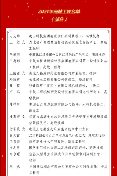 ? ? ?11月10日,在2021年荊楚工匠培育創(chuàng)建工作視頻會議上,湖北省總工會公布100位2021年“荊楚工匠”,人福醫(yī)藥集團向永曜和王圓圓入選。